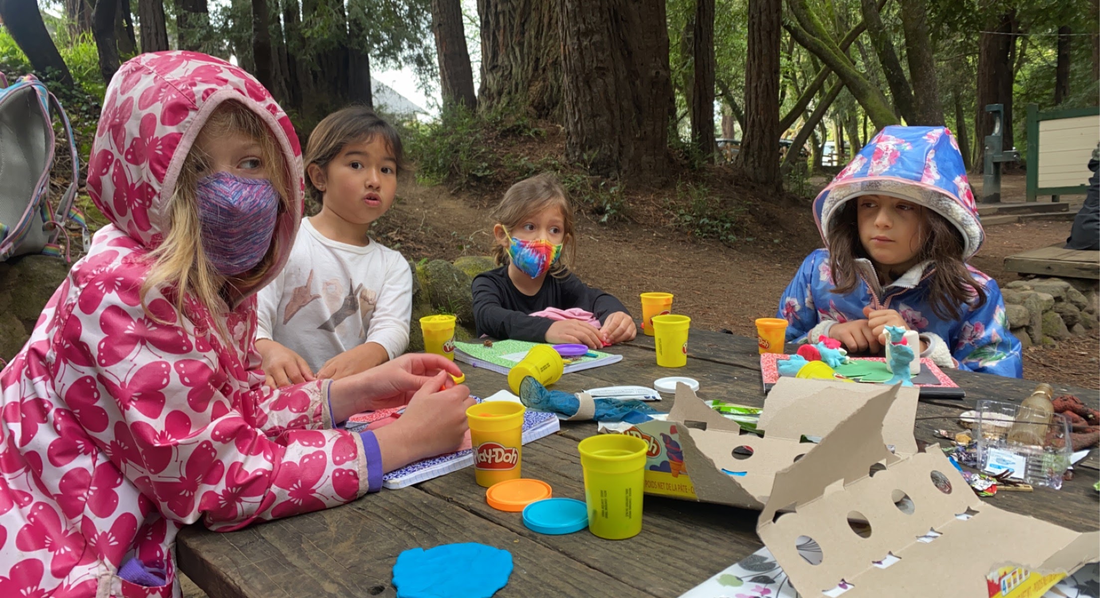 This week was a very gloomy and rainy day in Marin. But, that didn’t stop us from having a wonderful day of exploration. This week we settled in at Old Mill Park. We started off our day by heading down to the creek to examine the water levels. We found ourselves fascinated with all the river rocks. We talked about their shape and how they had smoothed out over time. We skipped rocks, made rock sculptures and even attempted to make a dam.